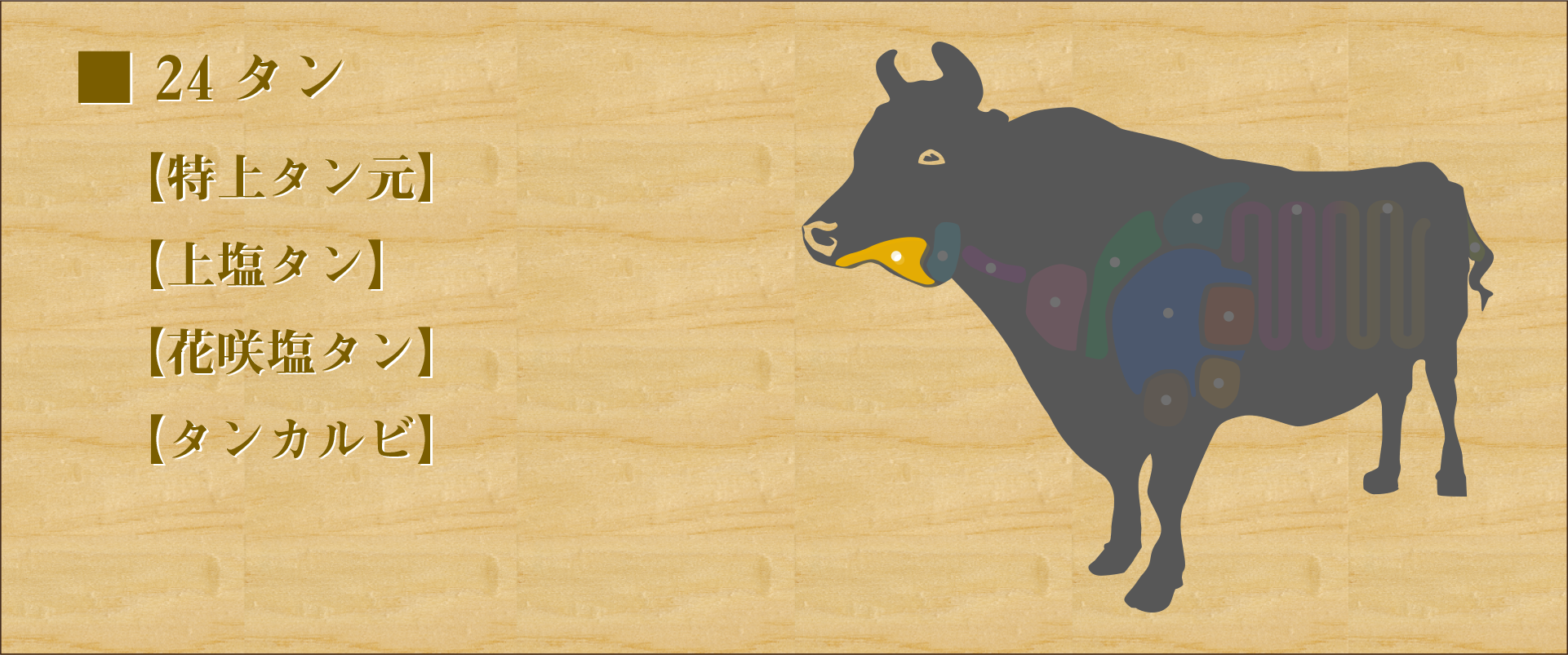牛の舌。 付け根は「タンモト」と呼ばれ高級部位で柔らかく重宝される。 ビタミンB群が豊富に含まれている。 程よい歯ごたえと独特の食感で人気の高い部位。 噛むほどに旨味が染み出し香りも楽しめる。薄くスライスしてあるタンは火を通しすぎると硬くなるため、さっと炙るように焼くのが良い。