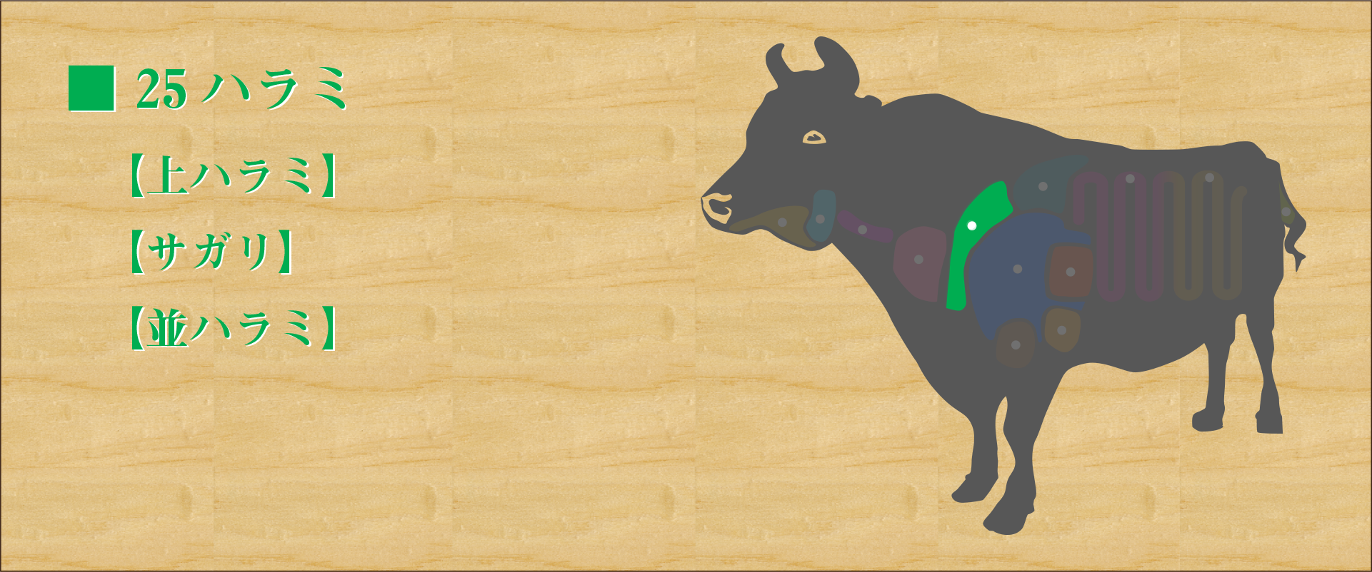 牛の横隔膜の部位。 横隔膜にはハラミとサガリの2種類あり、ハラミは長く薄く筋肉の部位、サガリは厚く長い内臓肉である。 脂身がなくあっさりしていてスジが少なく柔らかいが、独特の歯ごたえを持つ。 ホルモンの中でも適度な霜降りを持ち、味が濃く、独特の歯ごたえで根強い人気を維持している部位。