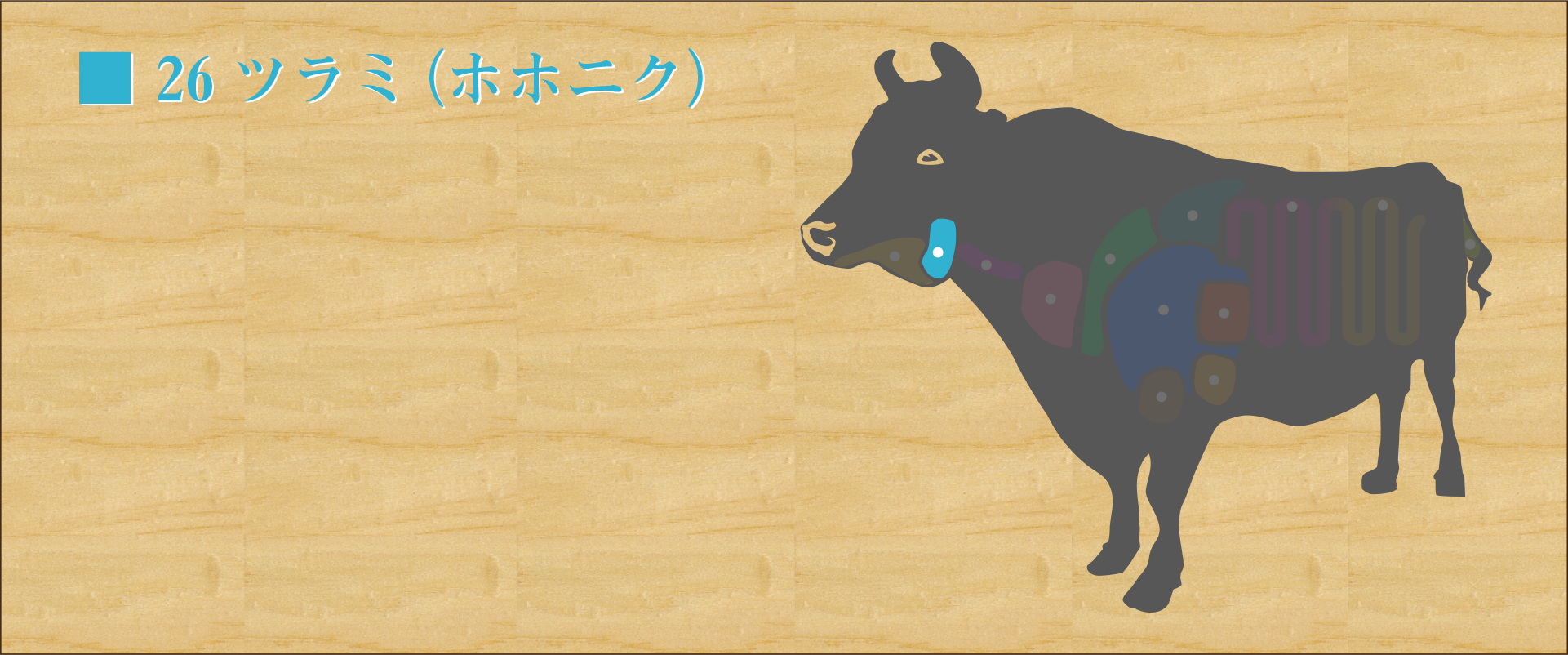 牛の喉軟骨。 1頭から少ししか取れない希少部位。 かなり硬いため、一般的に細かい切れ込みを入れ、食べやすくする下処理が必要。 コリコリした食感を楽しむ部位。 コラーゲンを含み、煮込むとゼラチン状になる。 淡白な味のためタレをつけてお酒のおつまみにも。 よく火を通してカリカリにして食べるのが良い。