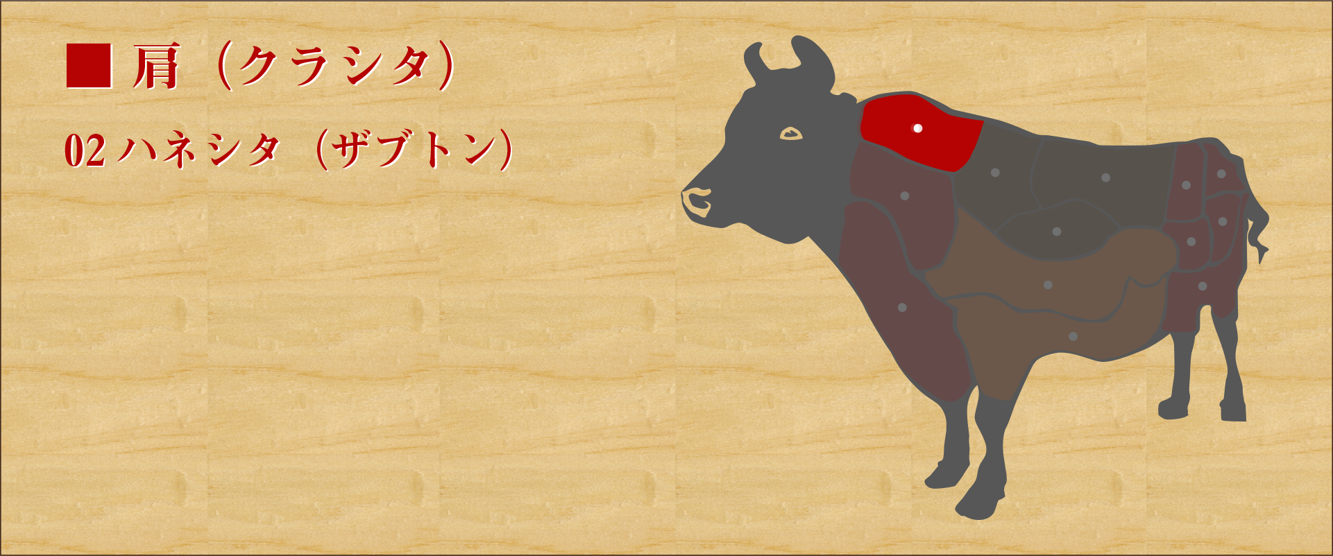 肩から背中にかけてのお肉で、最も大きな部位のひとつ。 脂肪が程よく霜降り状に分散していて、霜降りと赤身肉のバランスが良く、肉そのものの味と霜降りの甘さが一体に味わえる。 多少スジがあるため、すき焼きやしゃぶしゃぶ等のスライスとして使われるが肉の味がしっかりしているため、焼肉としても美味。
