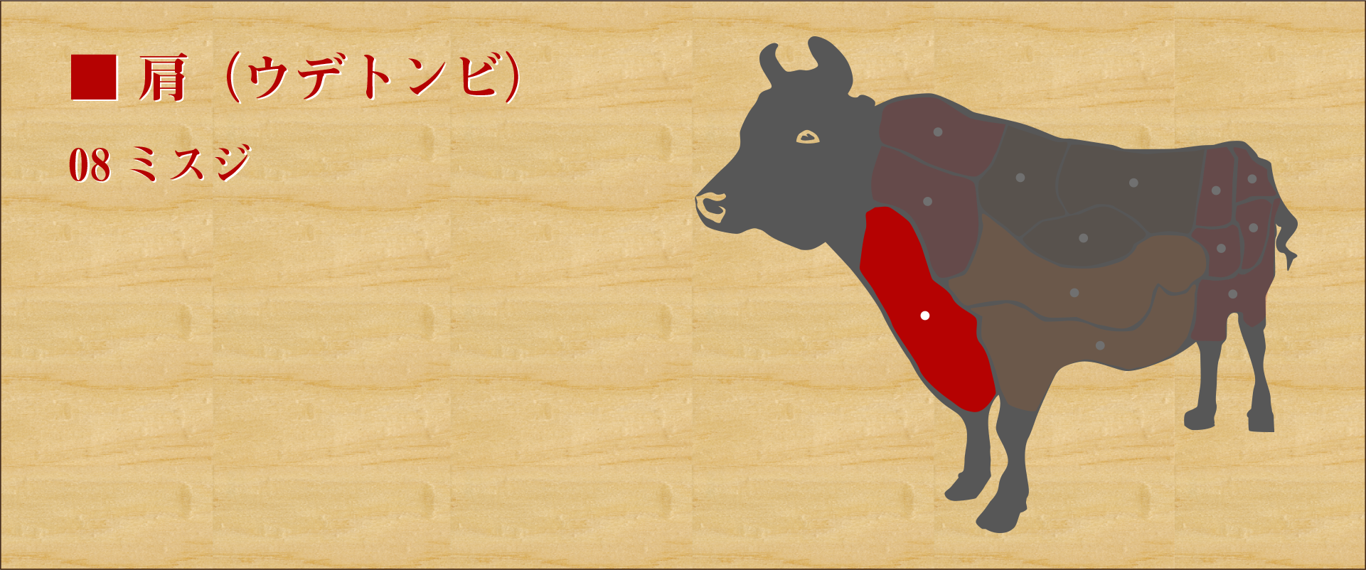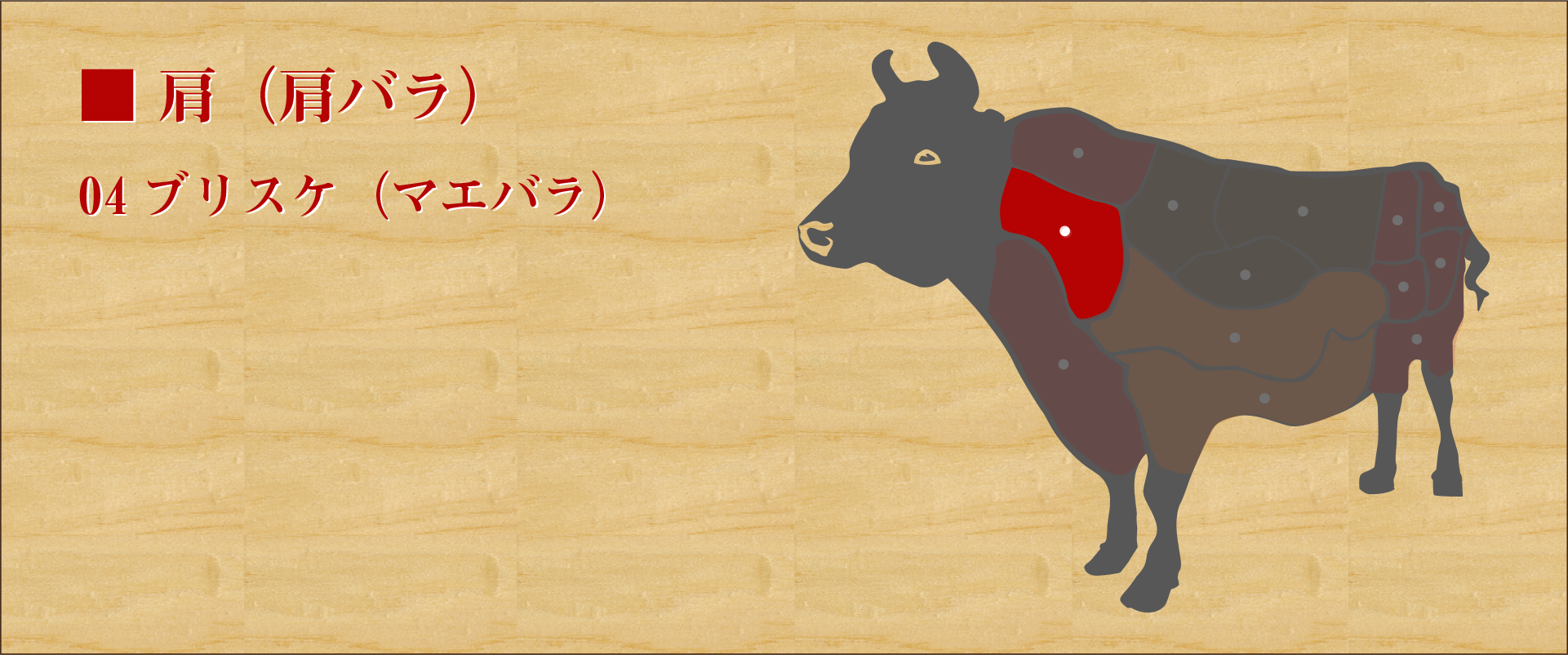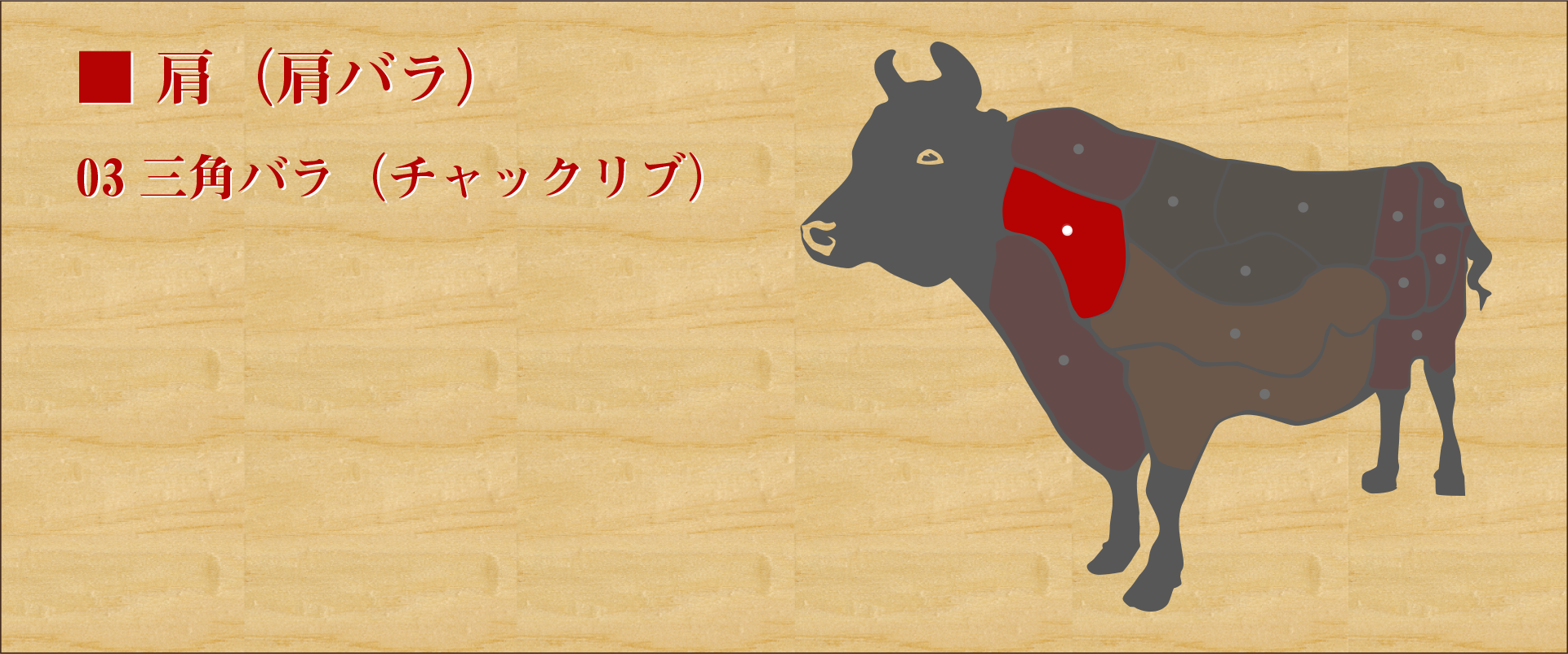 前足の付け根部分。 他のバラ肉より肉質は硬いが脂には濃厚な旨味が詰まっている。 バラ肉よりは脂肪分が少なく、淡泊な味だがモモ肉より肉の旨味が強い。 程よい歯ごたえがあるため、シチュー等の煮込みにするイメージがあるが、焼肉でも脂と赤身のバランスが良く、肉の味を楽しみたい方にはおすすめ。