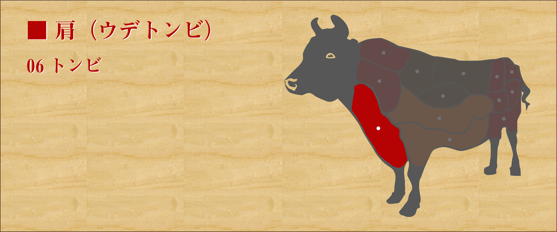 1頭の牛から約3kgしか取れない希少部位。 肩甲骨の内側にあり、肩の中でも1番の霜降りと柔らかさを持つ。 バラ肉(カルビ)とはまた違った口溶けで、独特の食感とキレの良い脂質で噛むほどに肉の旨味が染み出てくる。 焼きすぎると水分が抜けてぱさぱさになるため、焼き目が付くくらいで食べるのが良い。