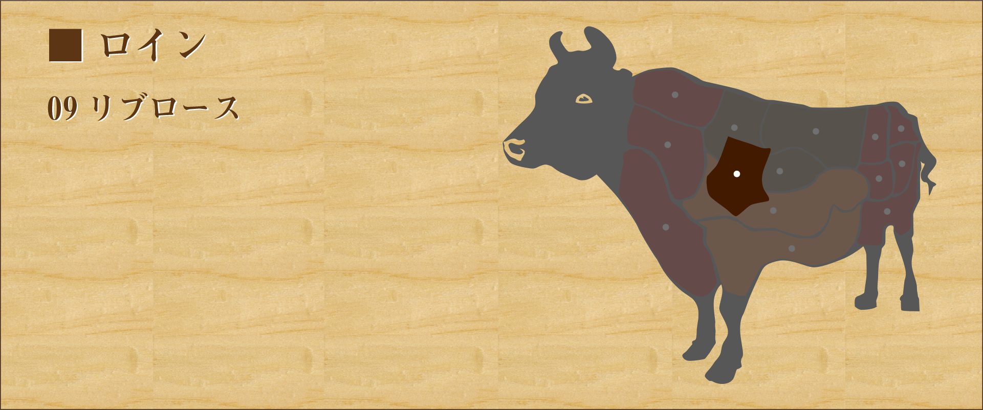 牛の肩から腰にかけての「ロイン」と呼ばれる部位の一部で、背側の肩ロースとサーロインの間に位置する。 最も厚みがあり、肉質は柔らかく風味、旨味が強い。 サーロインより霜降りは劣るが、赤身の肉味と脂の甘味どちらとも堪能できる。 焼肉、スライス、ステーキなんにでも合うオールラウンダーな部位。