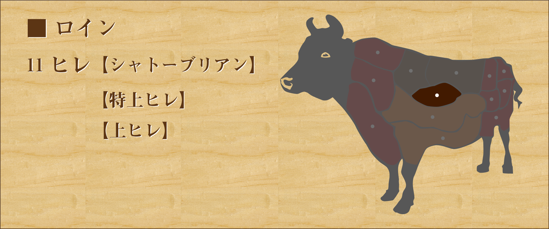 1頭の牛から約3%しか取れない希少部位。 相場が5千円〜1万円と高級部位だが、当店では3千円前後の価格で味わうことができる。 内臓に近く、ほとんど運動しないため脂肪が少なく、スジがないため柔らかい。 キメの細かい赤身肉で、肉質・霜降りが細やかで美しく、味も上品で奥深い。