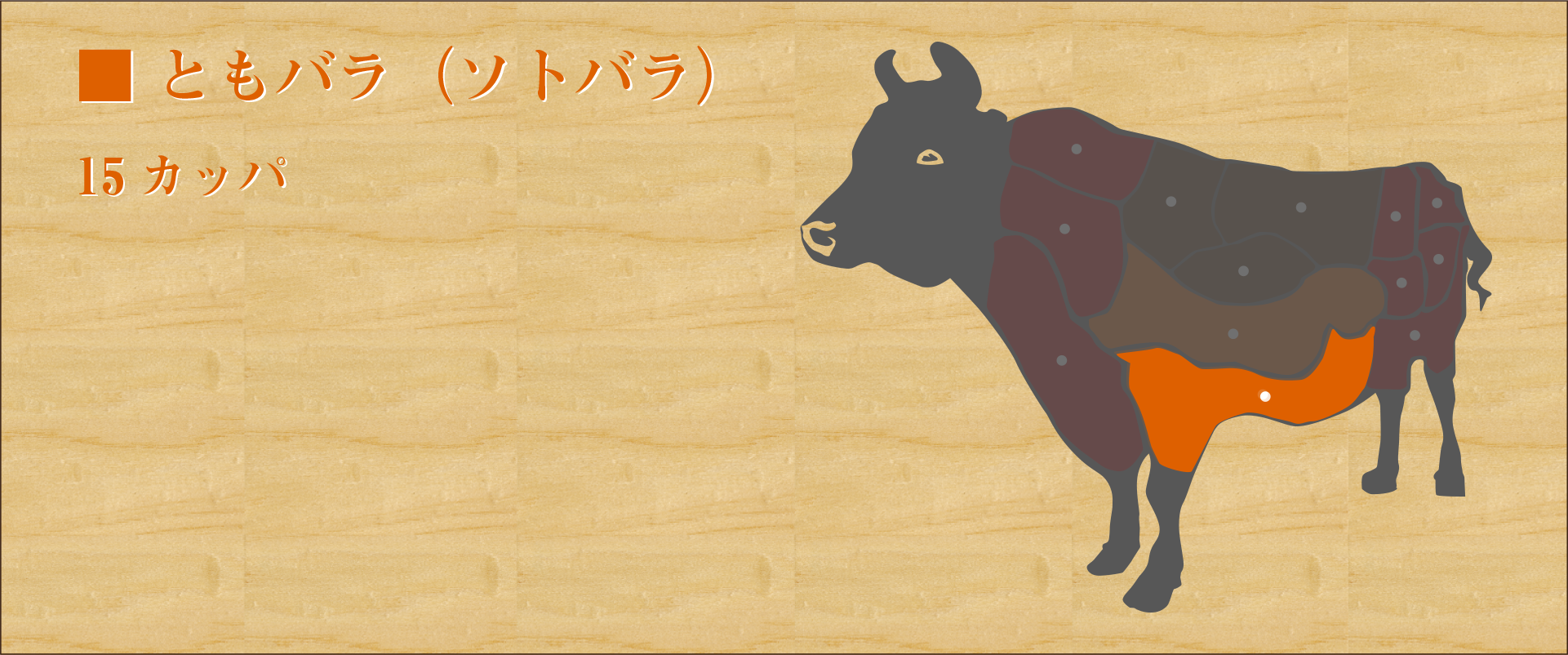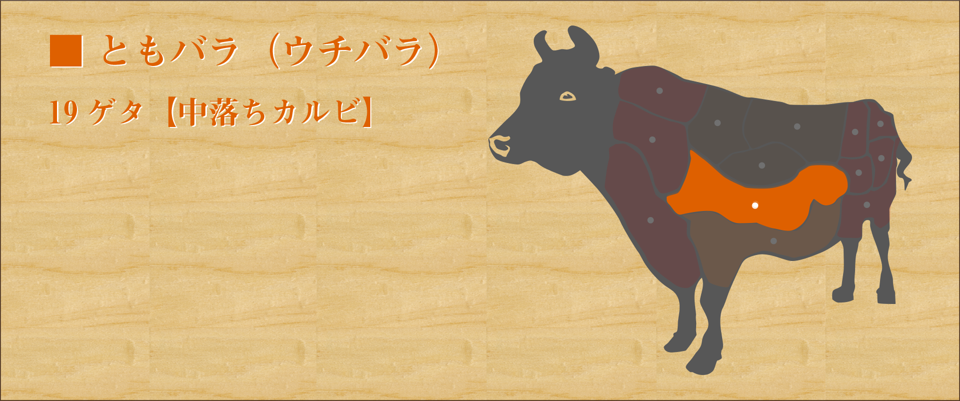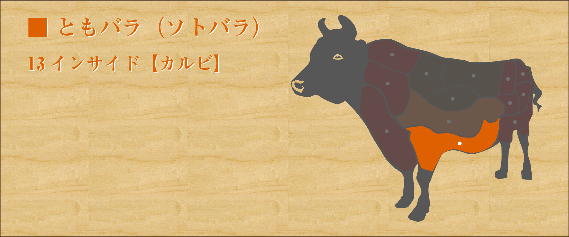横隔膜(ハラミ)の近く、ソトバラの内側の部位でバラ肉のひとつ。 ハラミのような濃厚な食感がありながらソトバラ特有の脂が豊富なため、独特のコクと強い旨味が特徴。 食感は少しざっくりとして歯ごたえがあるが、噛むほどに肉の味が染み出る。 軽く炙るように焼き表面がカリッとしてきたら食べ頃。