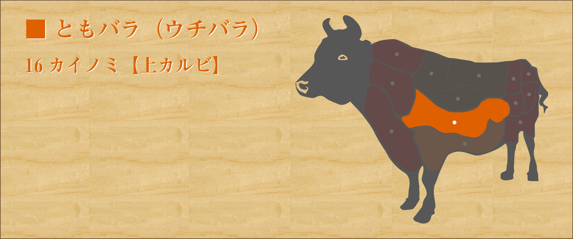 肋骨の間にある肉をそぎ落とした部位。 他のバラ肉の部位に比べ脂が多めで肉の味もしっかりしていて濃厚かつジューシー。 ただし脂がしっかりのっているのでこってりしている。 牛肉の質によって味の違いが出やすい部位のため、肉の良し悪しが大きく関係する。 しっかり脂に火を通して食べると美味。