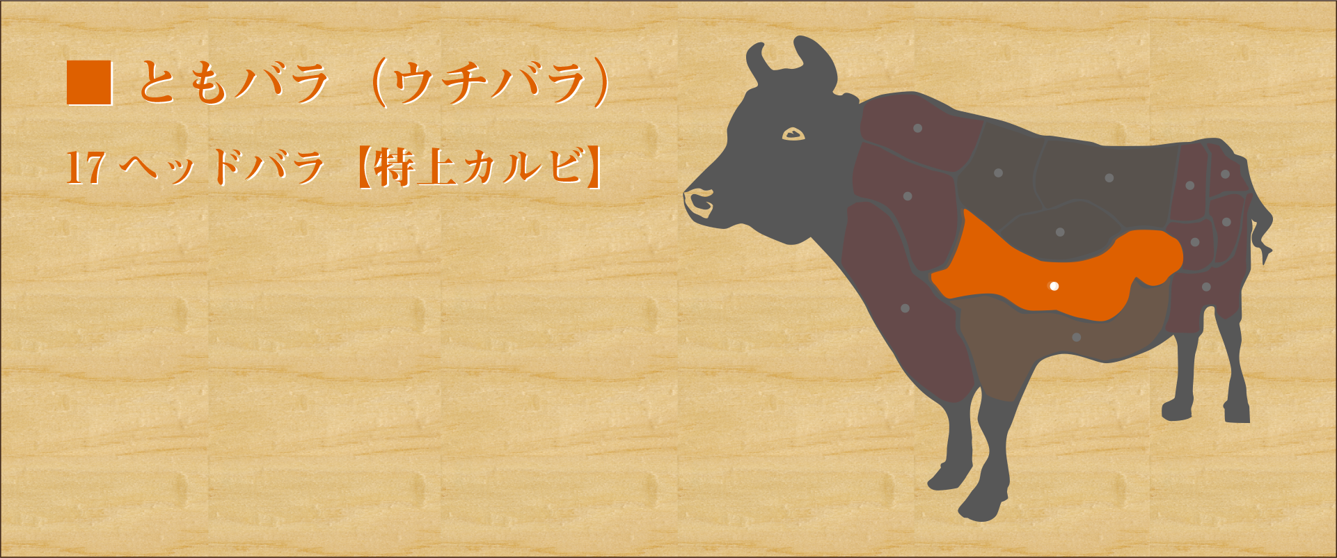 三角バラとウチバラのつなぎ目の部位。 ウチバラの先端に位置することからヘッドと呼ばれる。 1頭の牛から数㎏しか取れない希少部位。ウチバラの中では1番の霜降りの美しさを持ち、とろけるような濃厚な味わい。 バラ肉(カルビ)の中では最高の肉質を誇り、特上の名前に相応しい見た目と美味しさを持つ。