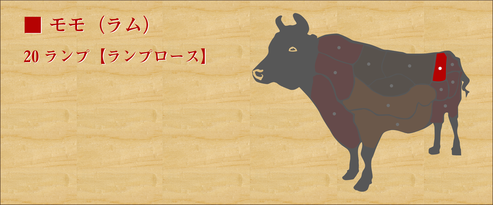 腰からお尻、モモにかけての部位。モモ肉の中でも特に柔らかいく、肉質はきめ細かい。 赤身部分は肉本来の味を味わうことができ、細かいサシが入るため噛むほどに旨味が広がっていく。 脂っこさとクセが少ないため食べ飽きることがない。 火を通しすぎないように気を付けて肉汁の濃厚な旨味を堪能する。