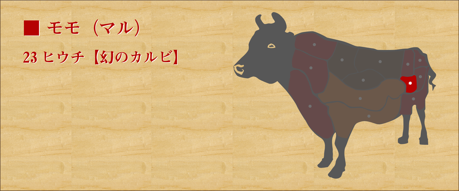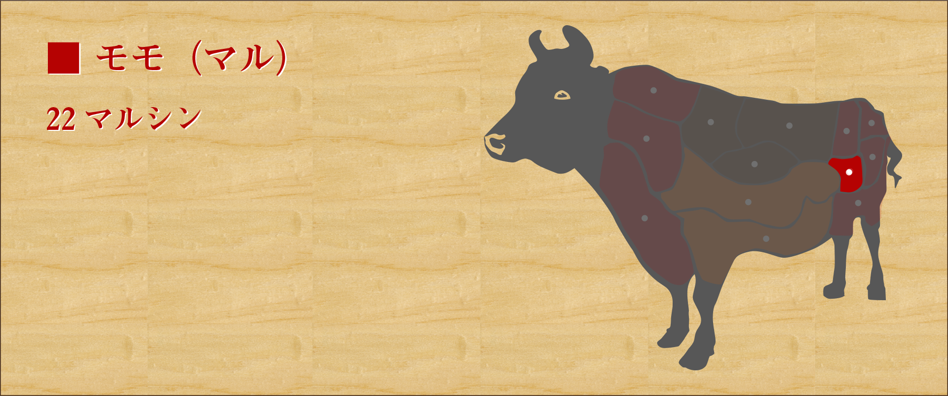 モモ(マル)のど真ん中にあり、円柱のような棒状の形をした部位。厚さにムラがなく、大きさも手頃のため、ステーキとして使われることが多いが焼肉でも美味。 肉質は多少スジがあるが、きめ細かく柔らかい。 食感は弾力があり、かつなめらかな食感が特徴。 脂もしつこくなく、味はクセがないため食べやすい。